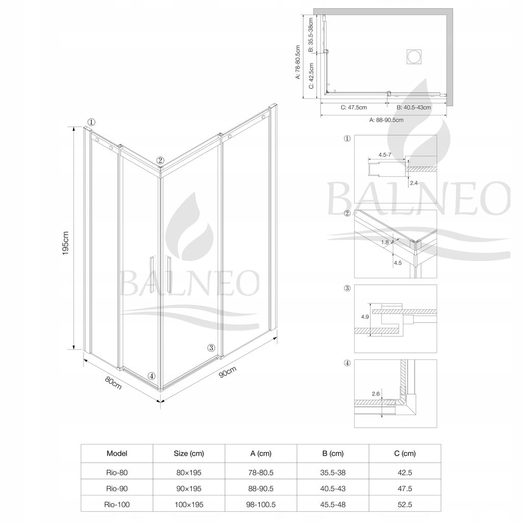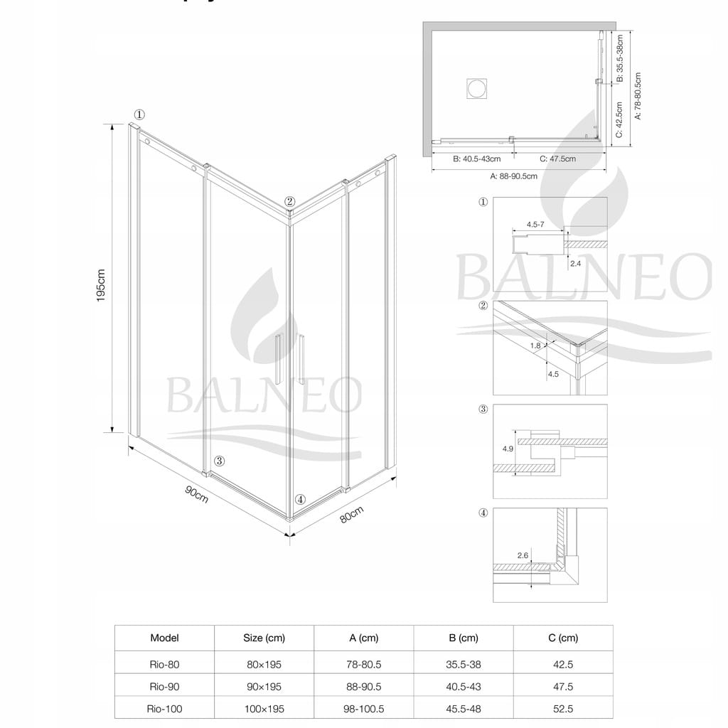 - Szerokość wejścia krótszej ścianki kabiny: 42-48cm jednego skrzydła
