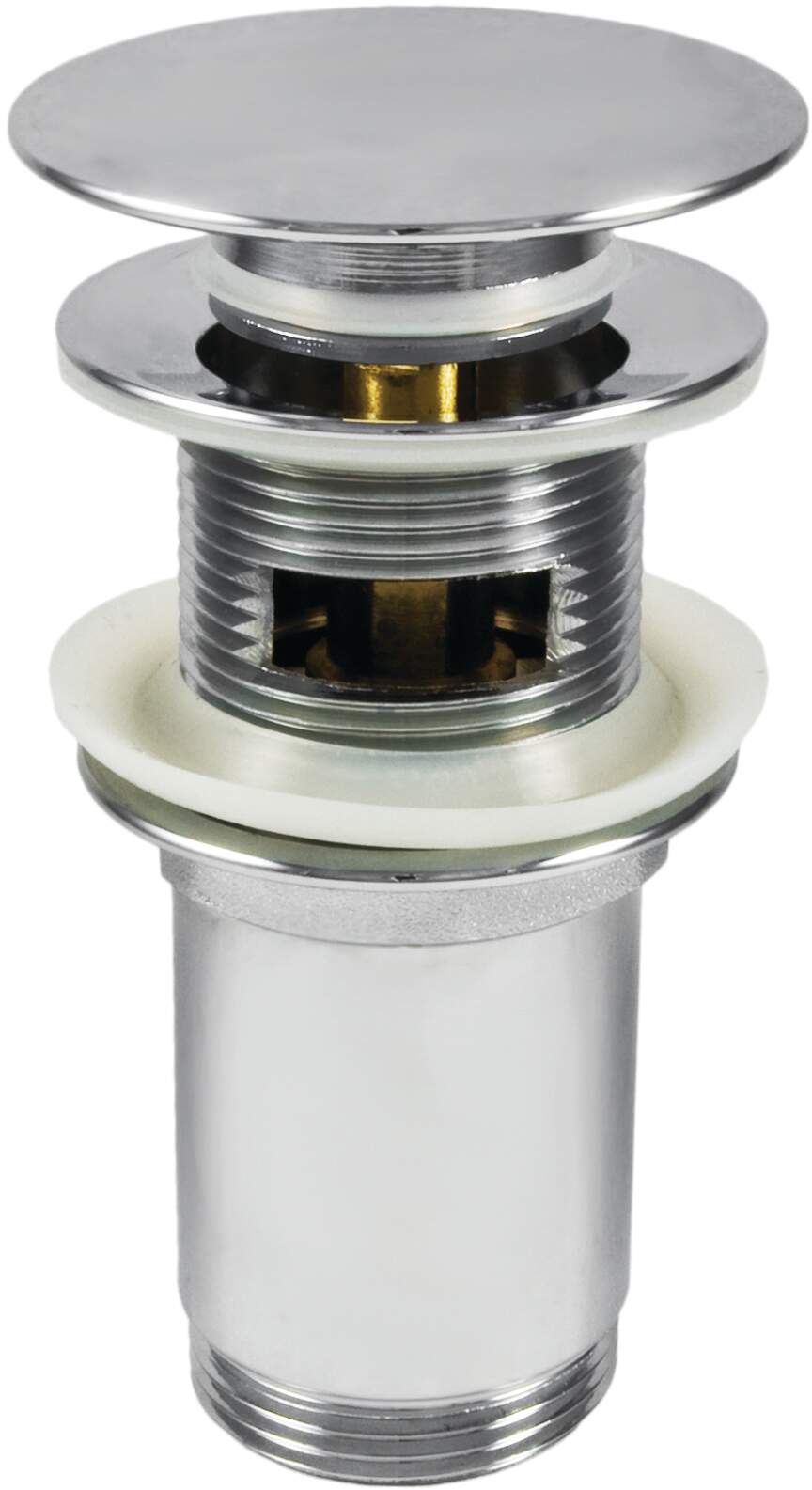 Mosiężny korek click-clack charakteryzuje się uniwersalnym zastosowaniem. Jest to korek bidetowy i umywalkowy. Tuleja pozwala na zamontowanie go zarówno do umywalek z przelewem, jak i bez przelewu. Otwarcie i zamknięcie odpływu następuje przez naciśnięcie korka palcem. Chromowe, błyszczące wykończenie idealnie pasuje do armatury w tym samym kolorze.