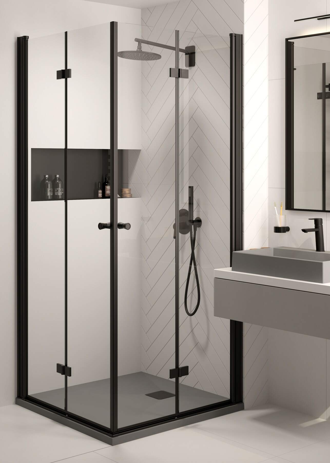 Składane drzwi prysznicowe Kerria Plus 100 cm, wykonane są z 6 mm szkła hartowanego Total White. Pokryte zostały powłoką Active Cover, która ułatwia spływanie wody po szybie. Drzwi można zamontować bez brodzika, na prawą lub lewą stronę. Eleganckie czarne wykończenie zachwyci miłośników nowoczesnego, loftowego stylu. Drzwi mogą być zastosowane jako samodzielny produkt do wnęki lub jako element kabiny.