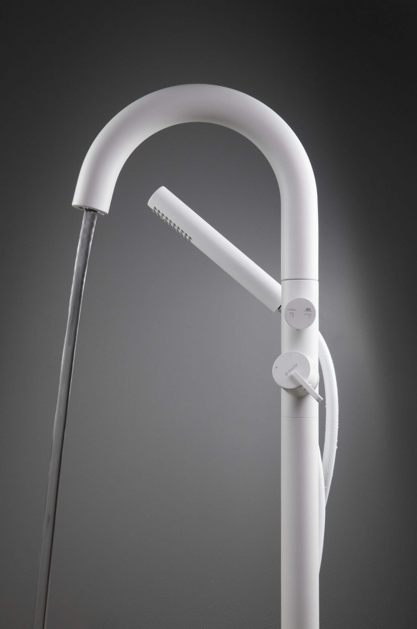 Bateria kolumnowa do wanien wolnostojących w wykończeniu matowe białe Bianco zachwyca subtelnością i minimalistycznym designem. Wylewka w kształcie litery „U” doskonale wpisuje się w nowoczesne trendy, dodając elegancji i harmonii każdej łazience. Wyposażona w wąż z systemem Anti-Twist, zapobiegający skręcaniu, oraz słuchawkę prysznicową o delikatnym strumieniu deszczowym, bateria zapewnia wyjątkowy komfort użytkowania. Mosiężny korpus i ceramiczna głowica gwarantują niezawodność i trwałość produktu. Regulowany kąt nachylenia słuchawki oraz precyzyjny, ceramiczny przełącznik funkcji czynią model nie tylko estetycznym, ale również bardzo praktycznym. Matowe białe wykończenie podkreśla świeżość i czystość formy.