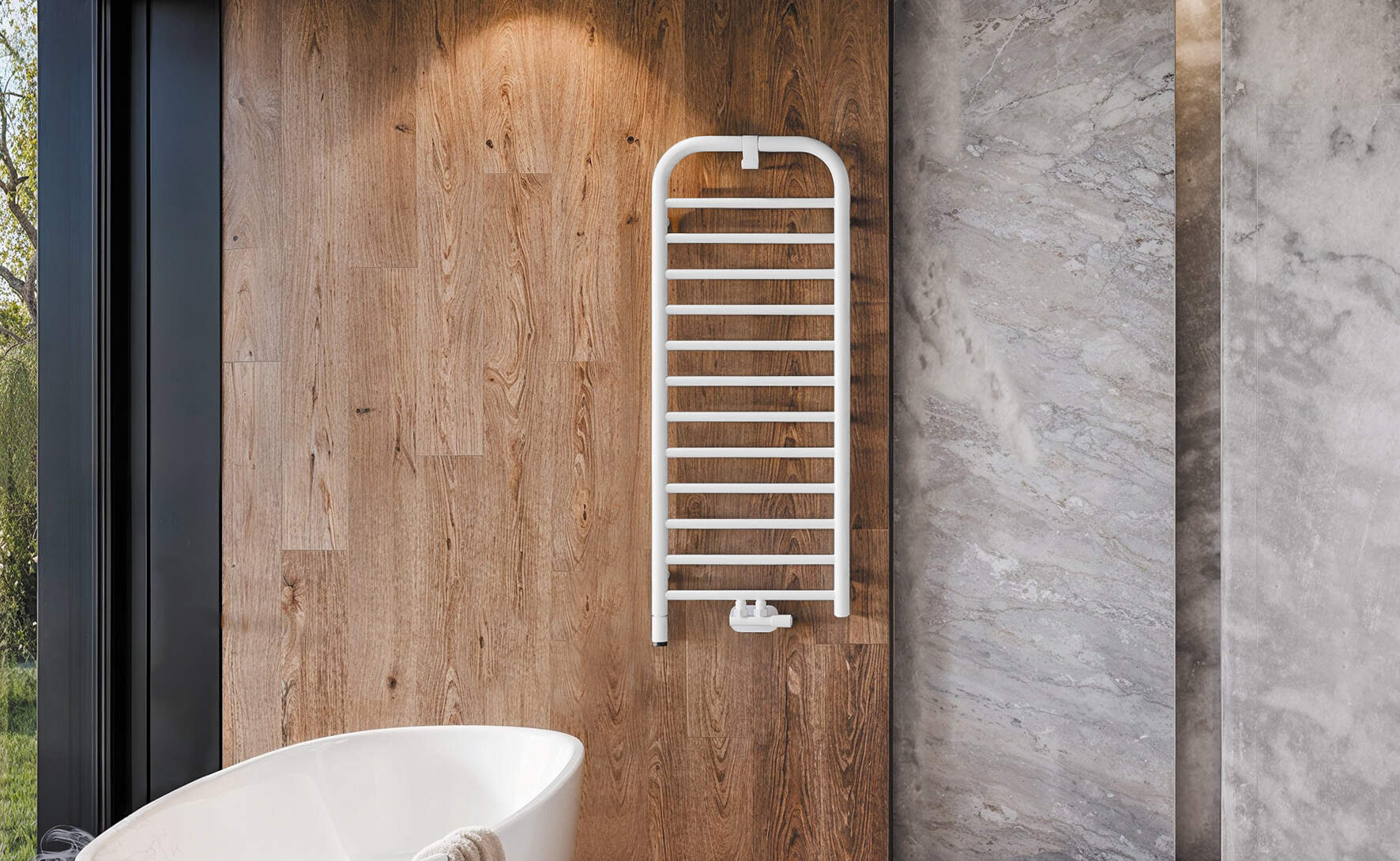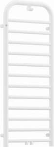 Nowoczesny grzejnik łazienkowy o rozmiarze 1210x500, wyróżnia się zaokrąglonymi kształtami i matowo-białym wykończeniem. Posiada praktyczny haczyk na ręcznik lub szlafrok. To hybrydowy model: wodno-elektryczny, z możliwością dokupienia grzałki 400W do dodatkowego ogrzewania lub suszenia ręczników poza sezonem grzewczym. Do grzejnika należy dokupić zawór. Zarówno opcjonalna grzałka, jak i niezbędny zawór dostępne są w tym samym kolorze co grzejnik.