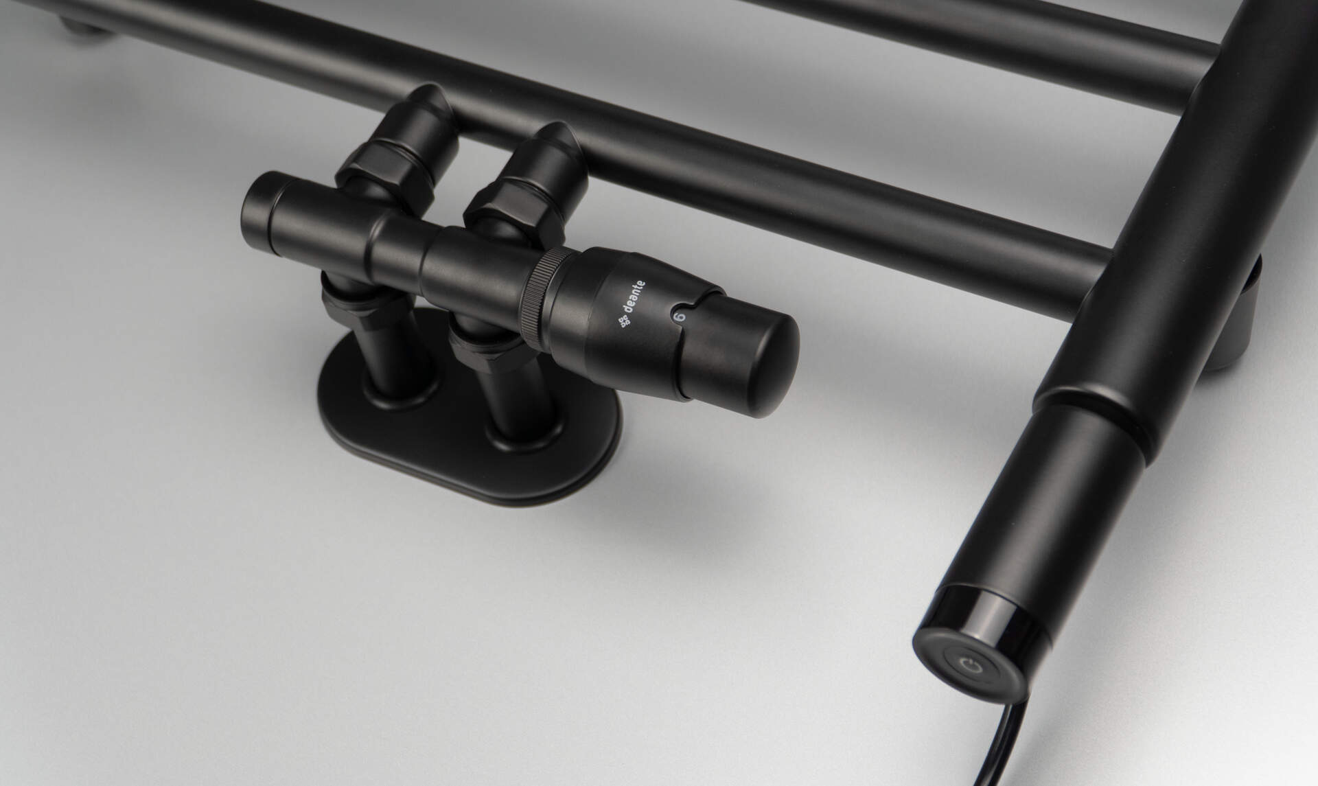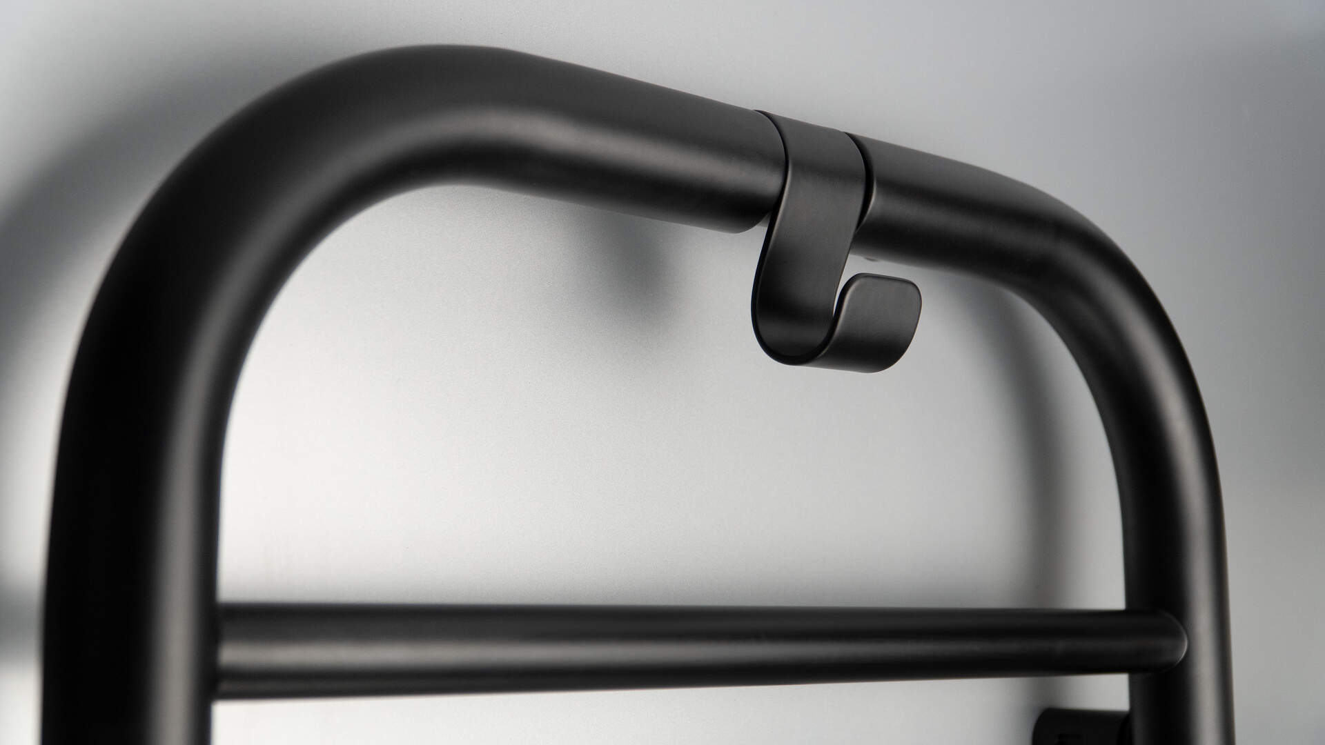 Czarny matowy grzejnik łazienkowy, rozmiar 1570x500, wyróżnia się obłym kształtem i wyjątkowym wykończeniem. Praktyczny haczyk na ręcznik lub szlafrok sprawia, że jest idealny do każdej łazienki. Hybrydowy model wodno-elektryczny z możliwością montażu opcjonalnej grzałki 600W, która oferuje dodatkowe ogrzewanie lub szybkie suszenie ręczników poza sezonem grzewczym. Do grzejnika należy dokupić zawór. Zarówno opcjonalna grzałka, jak i niezbędny zawór dostępne są w tym samym kolorze co grzejnik.