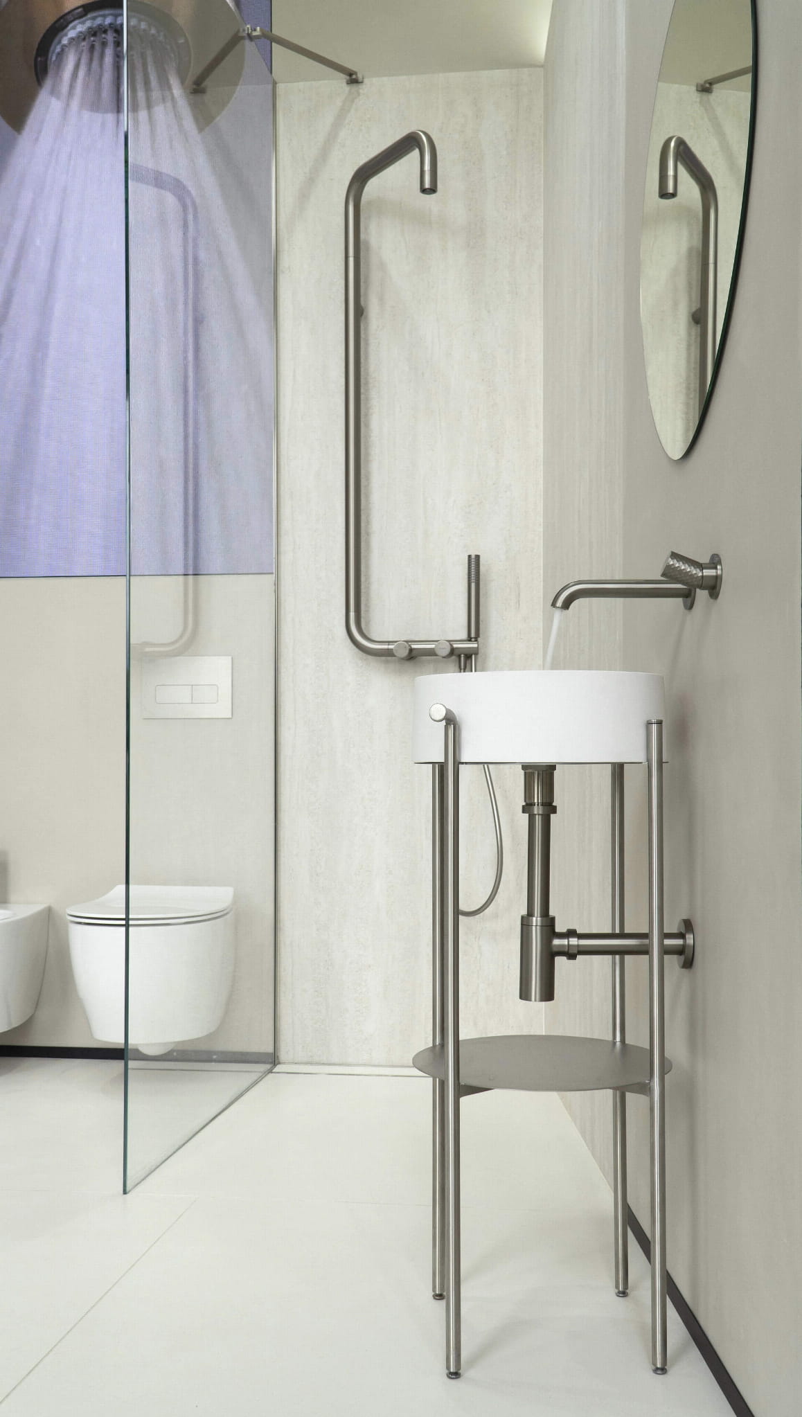 Bateria umywalkowa podtynkowa pochodzi z jubileuszowej, limitowanej serii Hexa, będącej częścią topowej kolekcji Silia. To model, który łączy nowoczesny design z najwyższą funkcjonalnością, doskonale wpisując się w trendy minimalistycznych i luksusowych wnętrz. Charakterystycznym elementem baterii jest biżuteryjna dźwignia o unikalnej, precyzyjnie wyfrezowanej strukturze, która nie tylko przyciąga wzrok, ale także zapewnia komfortową obsługę. Geometryczne detale harmonijnie współgrają z opływową wylewką, tworząc spójną i elegancką kompozycję. Model ten został wykończony w stali szczotkowanej, co podkreśla jego industrialny, a zarazem ponadczasowy charakter. Powierzchnia jest odporna na ślady użytkowania i łatwa w utrzymaniu czystości, co czyni baterię idealnym wyborem do codziennego użytku. Bateria Silia Hexa to połączenie wyjątkowego wzornictwa i niezawodnej jakości. Wykonana z wysokogatunkowego mosiądzu, gwarantuje trwałość i odporność na korozję. Podtynkowy montaż pozwala na zachowanie minimalistycznej estetyki i sprawia, że armatura staje się subtelnym, lecz wyrafinowanym elementem wystroju łazienki.