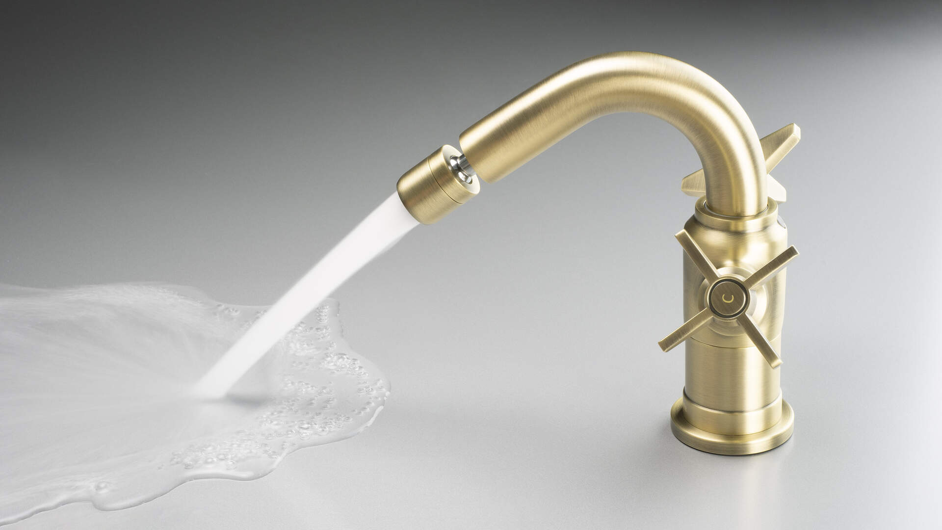 Bidetowa bateria Temisto w przyciągającym wzrok, mosiężnym wykończeniu będzie doskonałym uzupełnieniem łazienek urządzonych za pomocą armatury z tej wielokrotnie nagradzanej kolekcji. Seria ta, choć nawiązuje do wnętrz w stylu retro, świetnie sprawdzi się zarówno w łazienkach klasycznych, jak i tych zaaranżowanych w nowoczesnym duchu. Dwuuchwytowa bateria bidetowa z pokrętłami o stylizowanym kształcie, wyposażona została także w aerator napowietrzający strumień. Ceramiczna głowica o kącie obrotu 90 oraz siedmioletnia gwarancja producenta to dodatkowe zalety produktu. Prezentowana tu bateria bidetowa ma luksusowe, mosiężne wykończenie, które nie tylko nawiązuje do retro stylistyki kolekcji, ale dzięki innowacyjnej technologii pokrycia, jest także wyjątkowo trwałe. Kolekcja Temisto nagrodzona została takimi wyróżnieniami jak Must Have 2020, "Łazienka" - wybór roku 2020 czy Top Design 2020, co gwarantuje najwyższą jakość produktu i doskonały design.