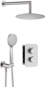 Zestaw prysznicowy zawiera słuchawkę z wężem i uchwytem, ultra cienką głowicę natryskową oraz box termostatyczny, tworząc kompleksowe rozwiązanie do każdej nowoczesnej łazienki. Słuchawka oferuje trzy funkcje strumienia - deszczowy, mieszany i hydromasaż. Dzięki ruchomemu uchwytowi, możesz ją precyzyjnie ustawić, dostosowując do własnych potrzeb, co zwiększa komfort użytkowania. Głowica natryskowa, wykonana z wysokiej jakości stali nierdzewnej, gwarantuje długotrwałą trwałość i odporność na korozję. Zarówno głowica, jak i słuchawka, są wyposażone w system Anti-calc, który umożliwia łatwe i skuteczne usuwanie osadów z kamienia, co ułatwia utrzymanie czystości. Box termostatyczny posiada blokadę temperatury na poziomie 38 stopni, przez co zapobiega przypadkowym poparzeniom. Wybierając ten komplet podtynkowy inwestujesz w produkt, który łączy funkcjonalność, nowoczesny design i wygodę. Montaż podtynkowy zapewnia minimalny wygląd i ułatwia utrzymanie łazienki w czystości. Wykończenie w kolorze stali szczotkowanej nadaje pomieszczeniu elegancki i nowoczesny charakter, idealnie wpisując się w minimalistyczne oraz industrialne aranżacje łazienek.