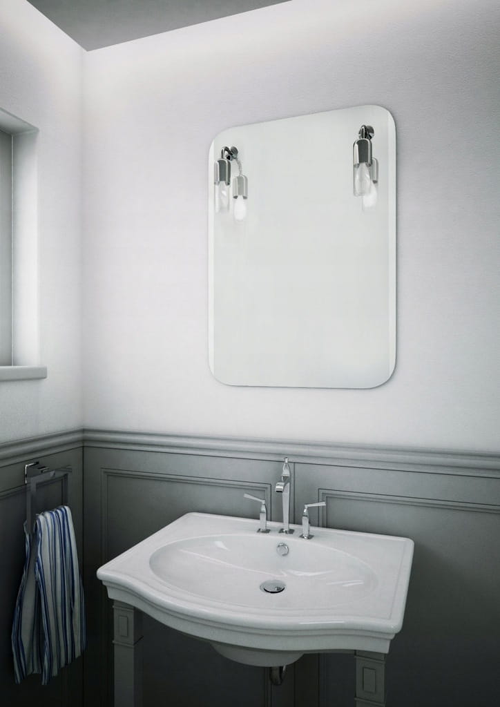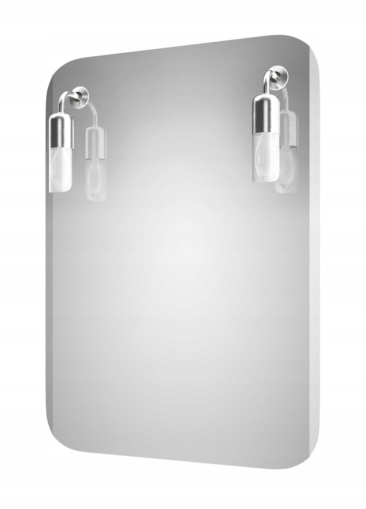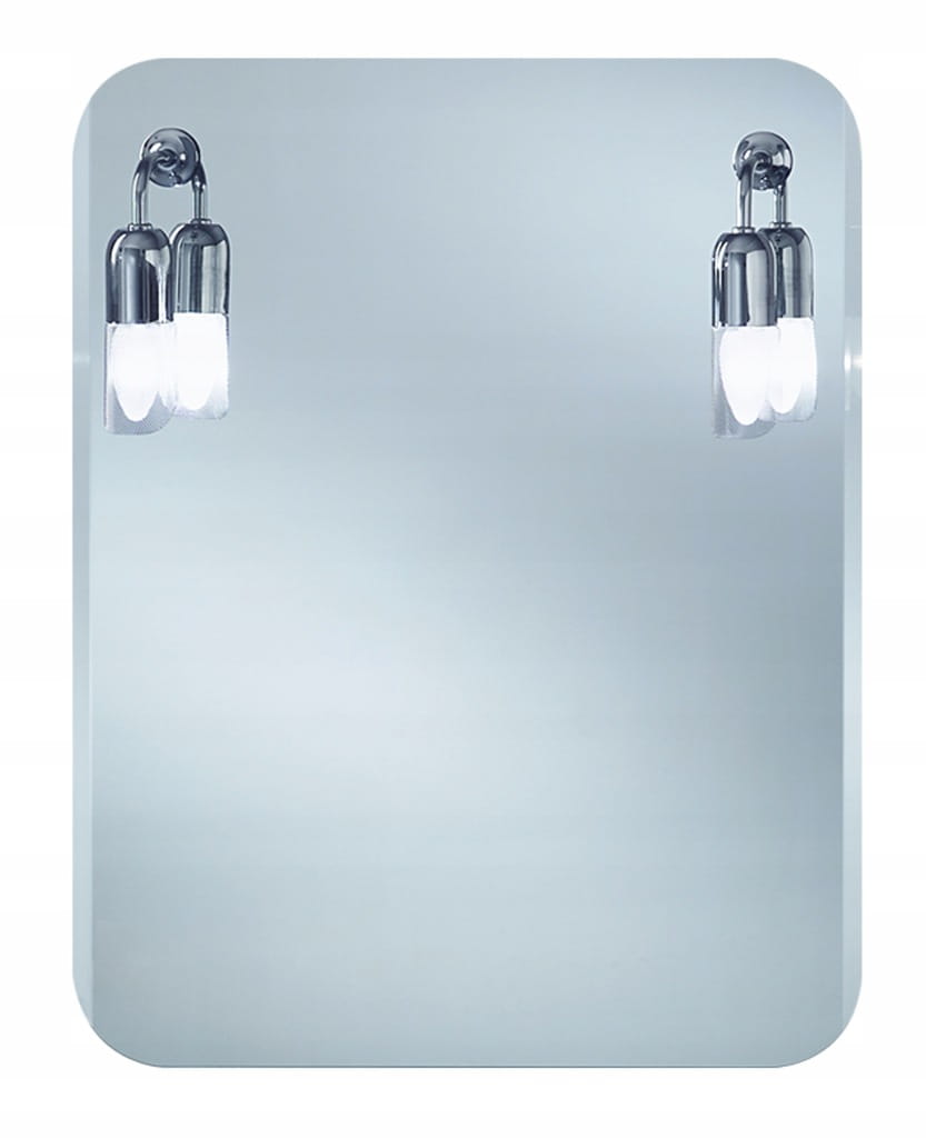 Lustro prostokątne z zaokrąglonymi rogami oraz fazą na odcinkach pionowych. Wyposażone w dwa kinkiety siatkowe.