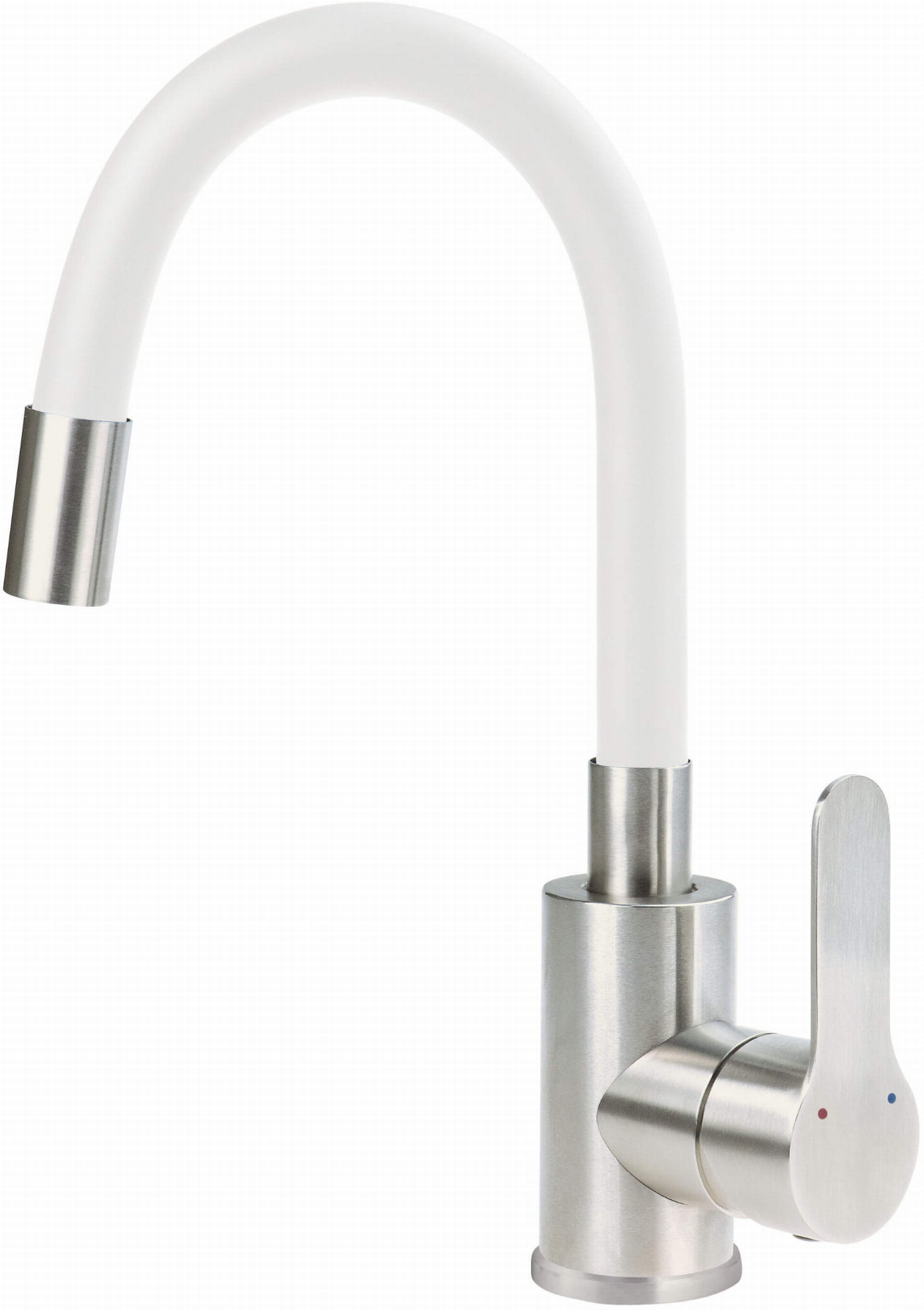 Bateria umywalkowa z kolekcji Lupo to idealne rozwiązanie dla tych, którzy cenią sobie przede wszystkim funkcjonalność. Gięta wylewka w kolorze białym dodaje baterii nowoczesnego charakteru, a jednocześnie jest niezwykle użyteczna. Ułatwia napełnianie większych pojemników wodą i utrzymanie czystości umywalki. Zintegrowany aerator pozwala oszczędzać wodę, generując miękki napowietrzony strumień. Korpus wykonany z wysokiej jakości stali nierdzewnej zapewnia długowieczność i odporność na korozję. Wykończenie w stali szczotkowanej nie tylko nadaje baterii nowoczesny wygląd, ale także ułatwia jej utrzymanie w czystości. Ponadto, bateria jest wyposażona w wężyki przyłączeniowe oraz tuleję montażową, co ułatwia jej instalację.