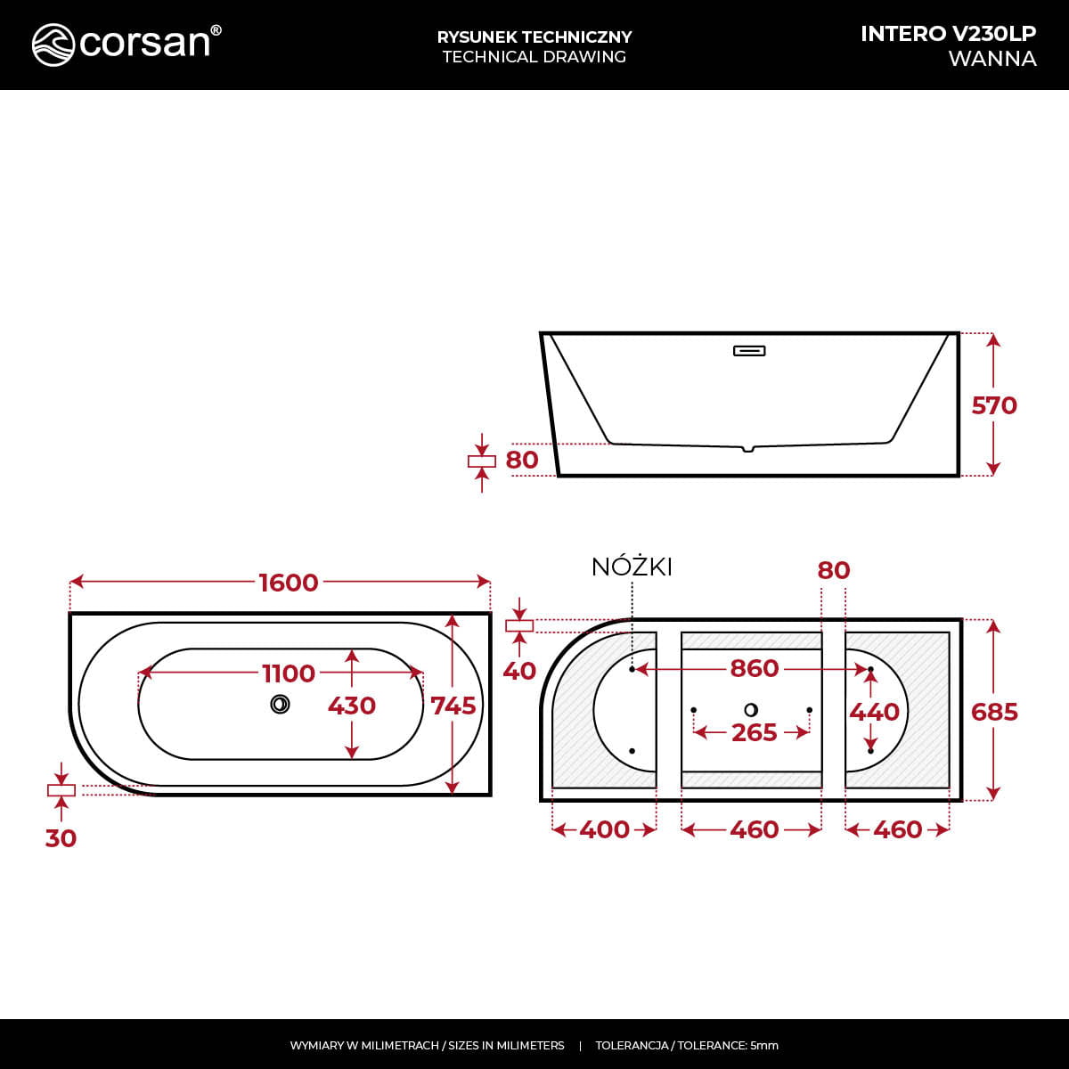 - 160 cm – pełen komfort kąpieli i swoboda ruchu.