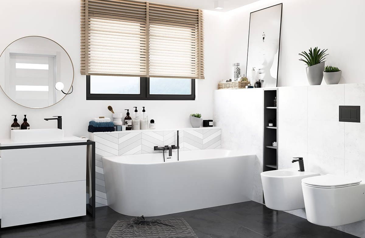 Wanna wolnostojąca narożna Corsan INTERO 150 x 74,5 Montaż prawostronny Korek klik-klak Chrom