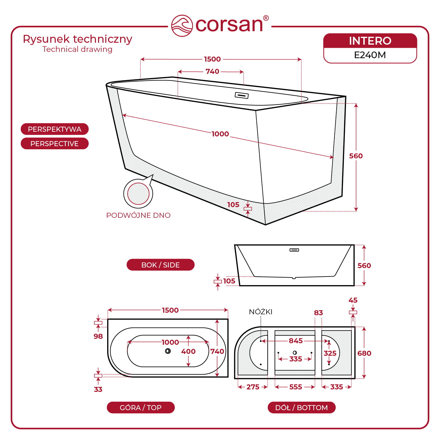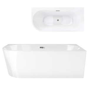 Wanna wolnostojąca narożna Corsan INTERO 150 x 74 z szeroką krawędzią Montaż prawostronny Korek klik-klak Chrom