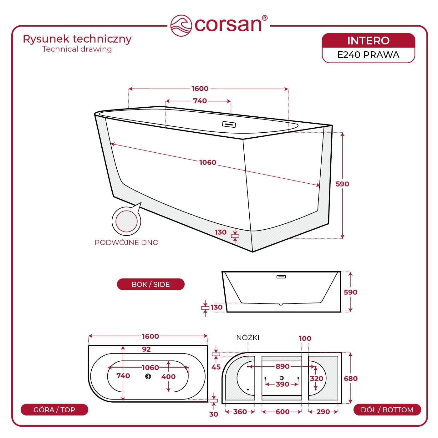 Wanna wolnostojąca narożna Corsan INTERO 160 x 74 Montaż prawostronny Korek klik-klak Biały