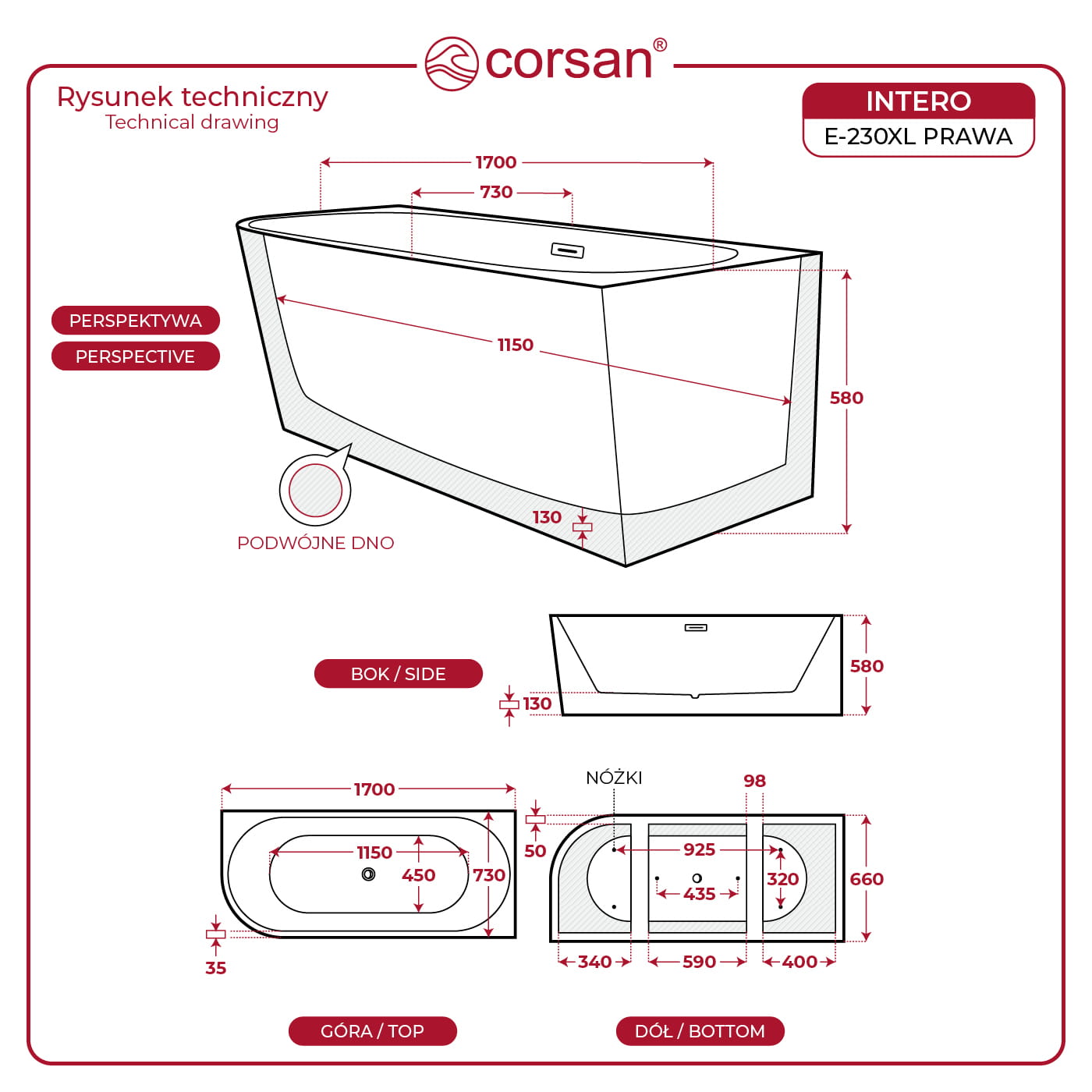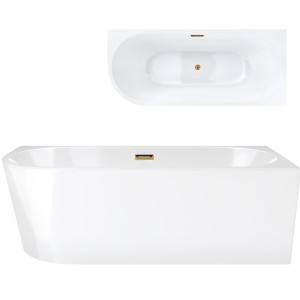 Wanna wolnostojąca narożna Corsan INTERO 170 x 73 Montaż prawostronny Korek klik-klak Szczotkowane Złoto