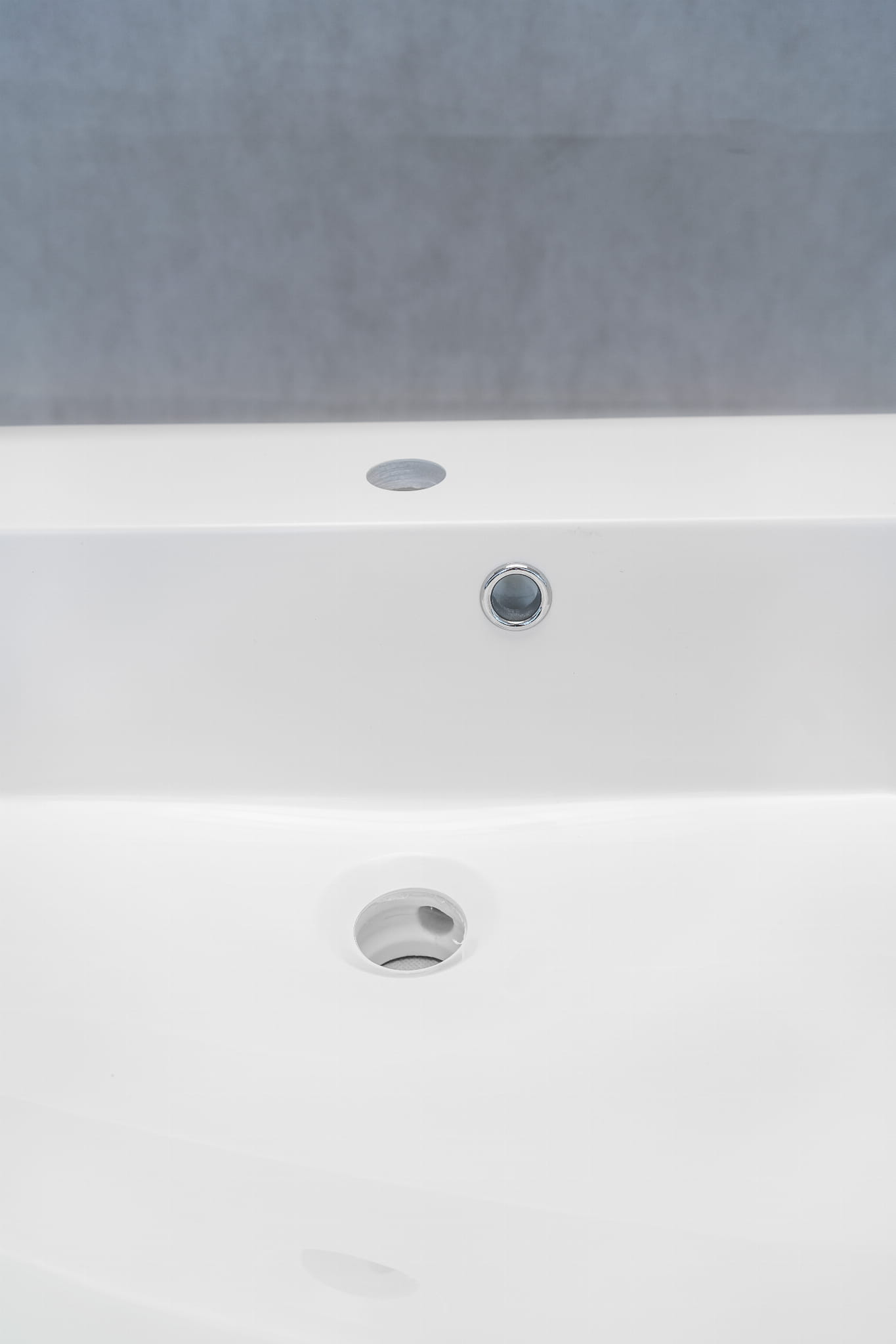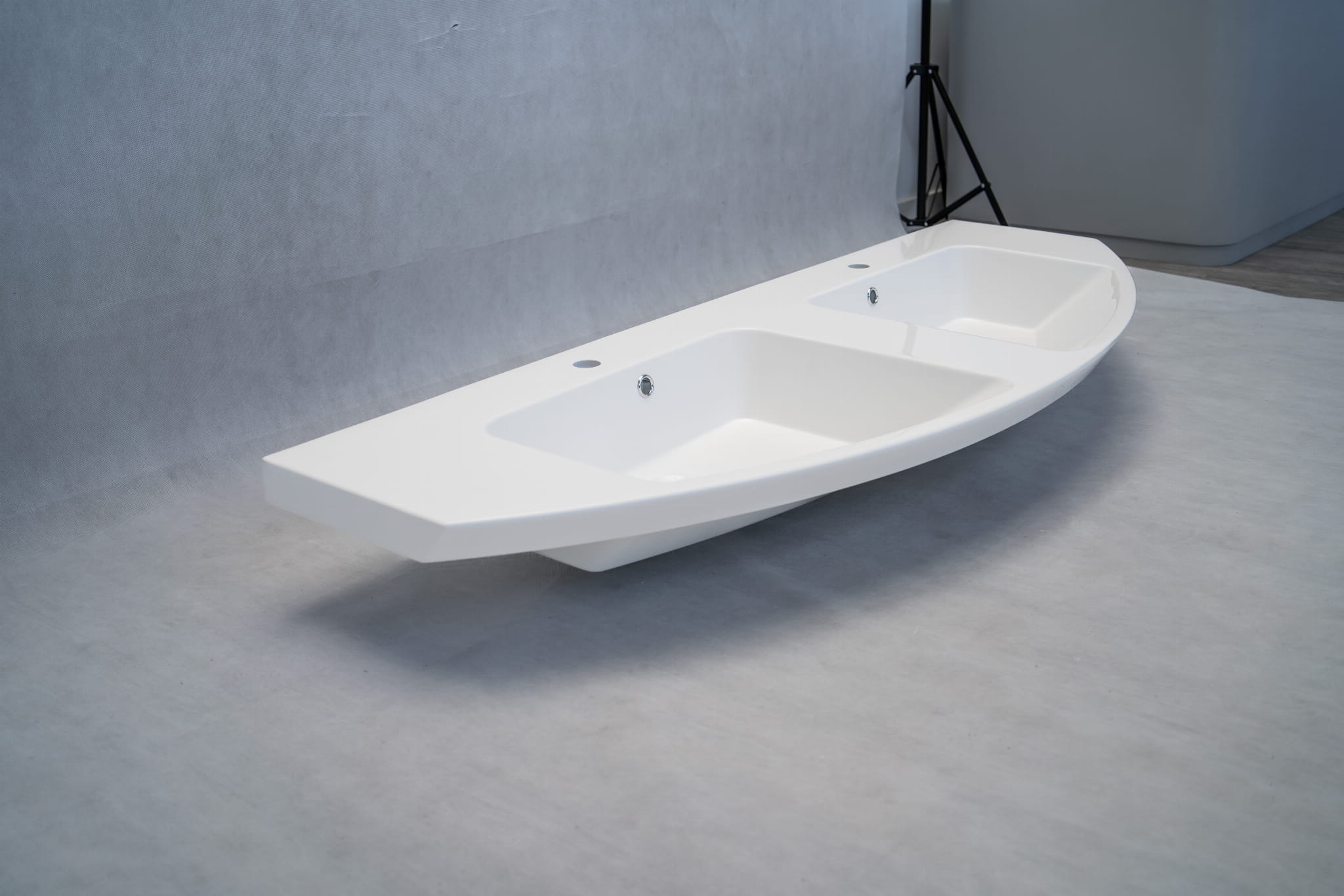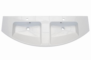 Zaokrąglony prostokąt i nieregularne niecki tworzą nowoczesną, elegancką bryłę. Biały kolor optycznie powiększa przestrzeń i doskonale komponuje się z naturalnymi materiałami oraz kontrastową armaturą.