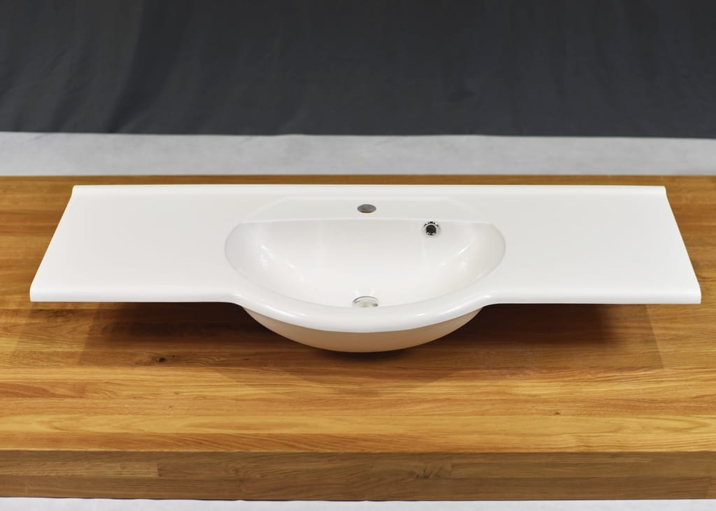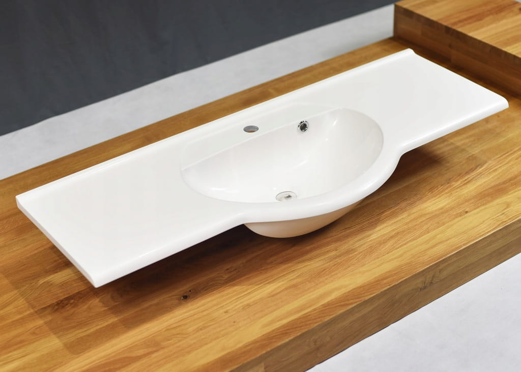 Umywalka półblatowa 110 cm została zaprojektowana tak, aby harmonijnie współgrać z zabudową meblową. Częściowe wpuszczenie w blat zapewnia: